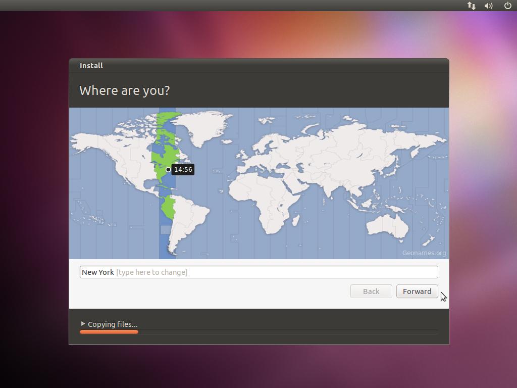 First, files are loaded from the CD and downloaded off the 'Net (if you say to do so) as the settings for language, time zone, user name and such are being asked. This is an excellent feature, especially if the person is going to be sitting there the whole time, by minimizing the perceived time required for the install to complete.
